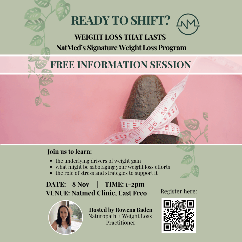 Join us for a free, 1-hour ONLINE information session about the drivers of weight gain and the common obstacles to weight loss. In this information session, Rowena shares critical information about NatMed’s signature weight loss program, SHIFT.